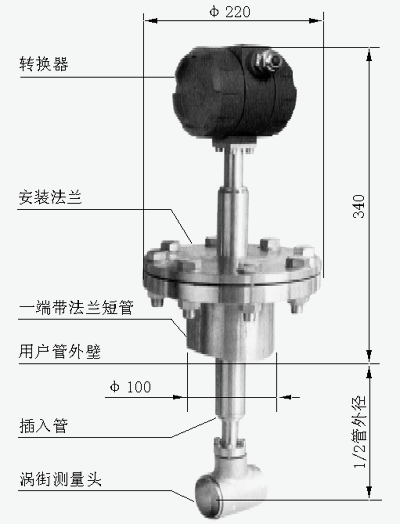 將渦街測(cè)量頭插入管道特定位置,通過(guò)測(cè)量該位置的局部流量,根據(jù)管道截面流速分布關(guān)系,計(jì)算出管道內(nèi)平均流速值。它由轉(zhuǎn)換器、插入桿組件、球閥( 根據(jù)需求配 )、安裝短管(ф100)、渦街測(cè)量頭等組成。